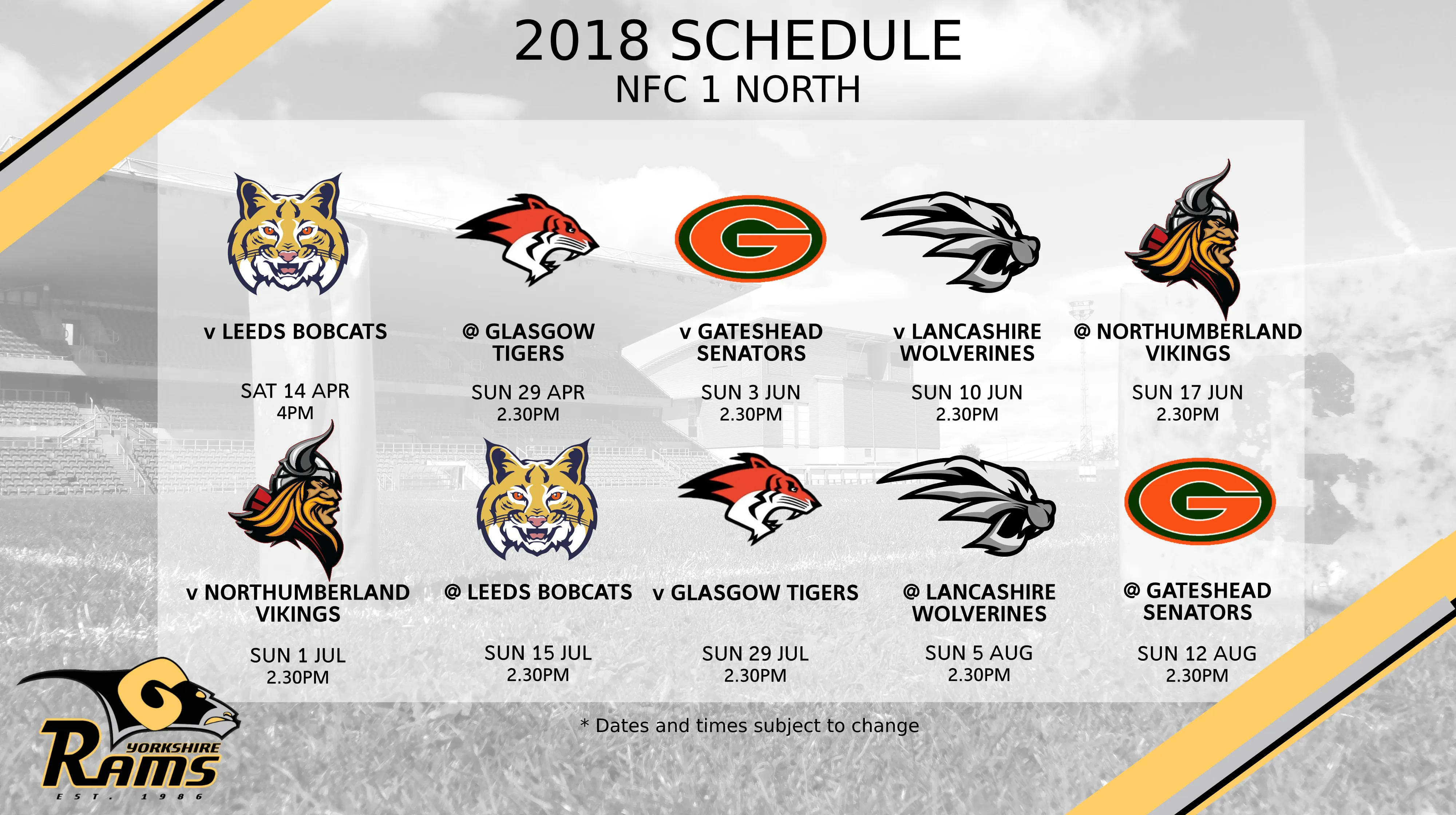 Following the success of last season’s final home game of the season against the Manchester Titans, which saw a bumper Saturday-evening crowd as well as a hard-fought Rams win, we will open up with a similar occasion against newly-promoted local rivals the Leeds Bobcats on April 14 at 4pm.